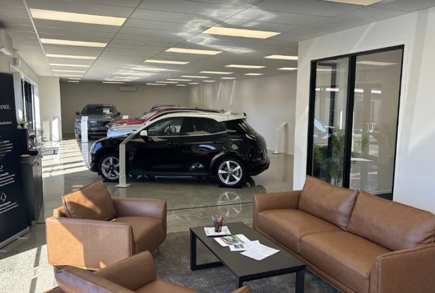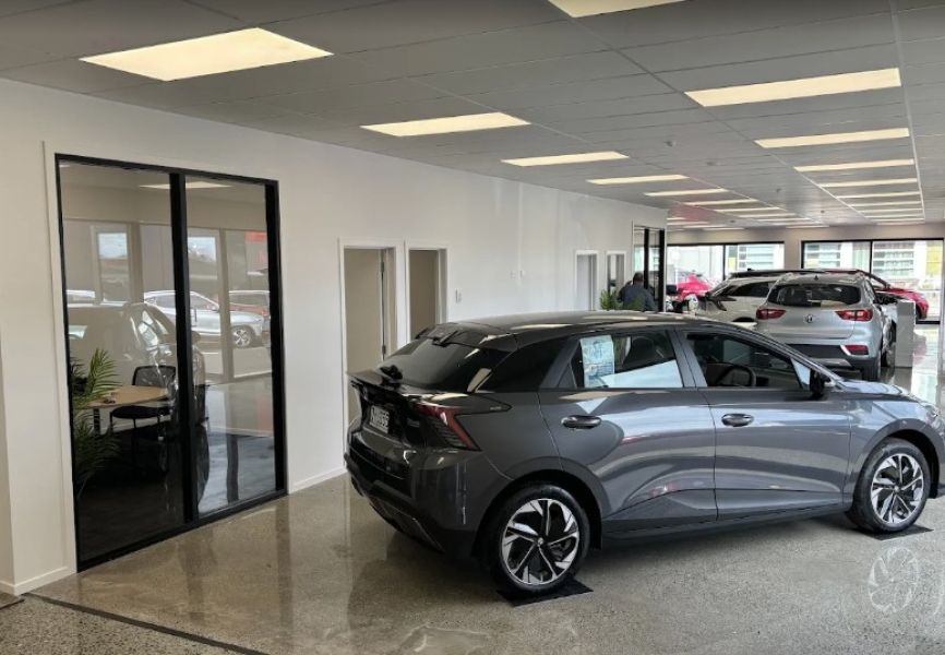 This recently renovated space has been redesigned into a modern car sales showroom, complete with polished concrete floors, expansive glazing, and a clean, stylish interior.