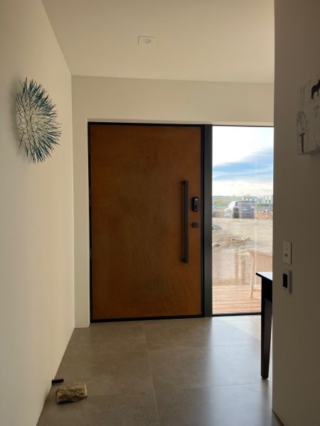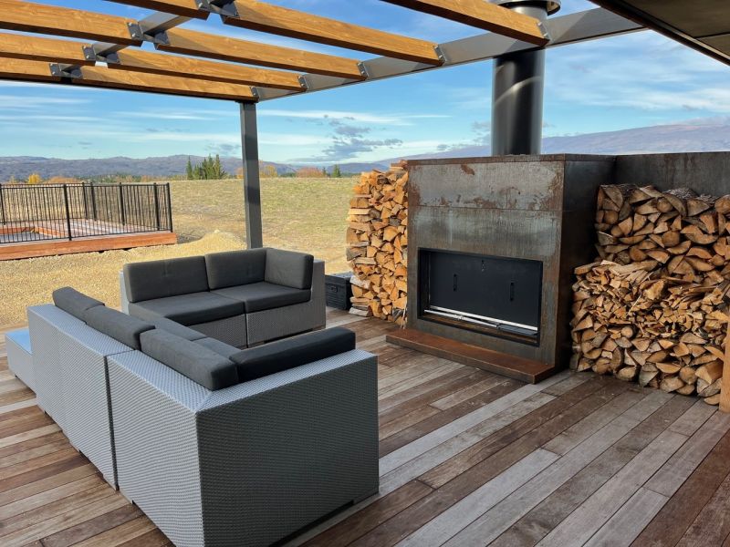 • Unique, warm and inviting Corten steel fireplace, front door, kitchen splash back and island